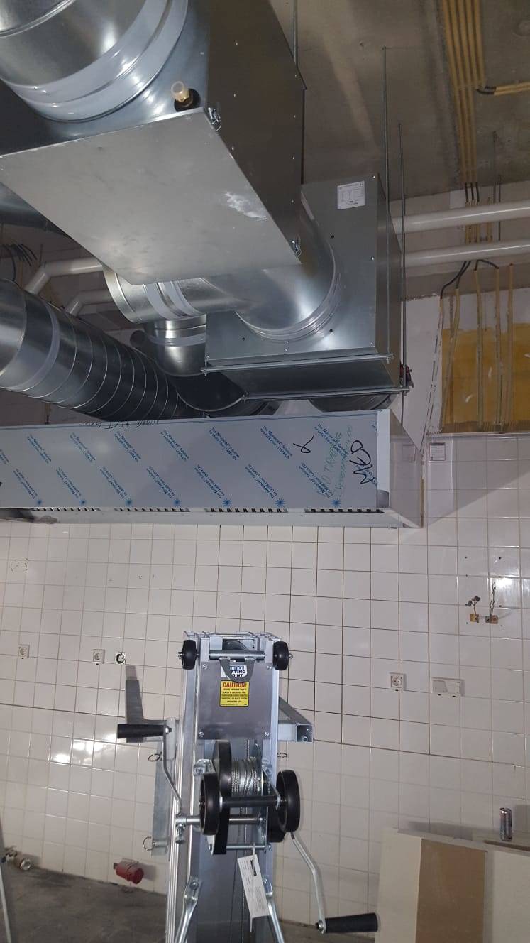 Er is gekozen voor luchttoevoer met luchtbehandeling en afzuiging met stijgkanaal. we hebben een mooie afzuigkap opgehangen 1.2 mm dik RVS 304, volledig gelast en voorzien van RSV labyrint filters. Door middel van toevoerroosters in de toevoerbuis wordt verse lucht ingeblazen in de bijeenkomstruimte. Via geperforeerde roosters blazen we lucht retour in de keuken.