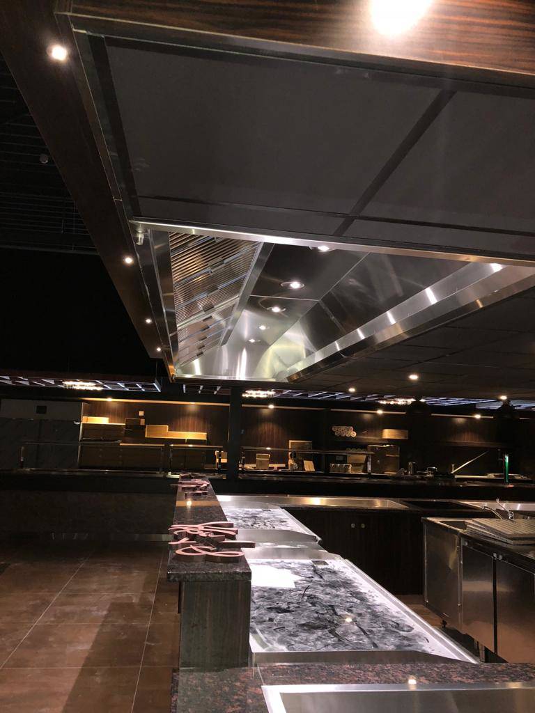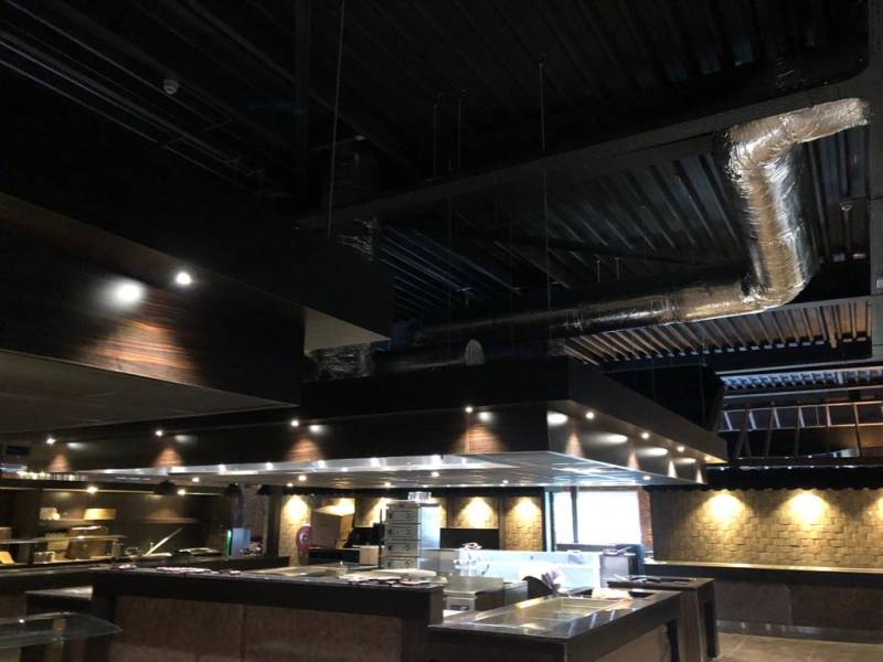We hebben voor een klant 6 inductie afzuigkappen geleverd en gemonteerd waaronder een kap van 14000mm lang met inductie. We hebben gebruik gemaakt van stijgkanaal en twee EC gelijkstroom ventilator met EC techniek. De Inductie afzuigkap is voorzien van luchtcompensatieroosters. De keukengedeelte is voorzien van 4 grote Airco-units van het merk Mitsubishi. We kunnen met deze installatie koelen en verwarmen. De toevoer van lucht wordt ingeblazen via een 60.000mm lange Airsock.